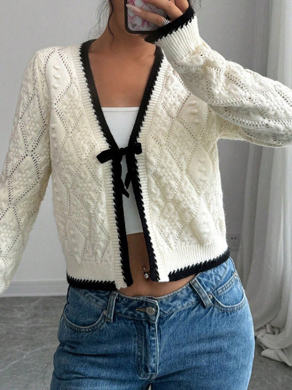 A cozy and sweet addition to your fall wardrobe, this cropped white cardigan features soft jacquard knit, long sleeves, a half open collar, and a chic black bow detail. Perfect for layering with high-waisted jeans or skirts.
