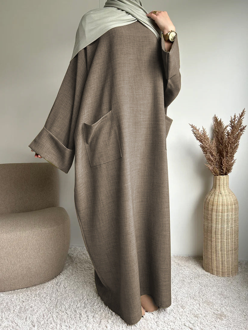 A modest, comfortable long-sleeve abaya dress designed for everyday elegance. Features roomy pockets and a relaxed fit for versatile styling without the headscarf.